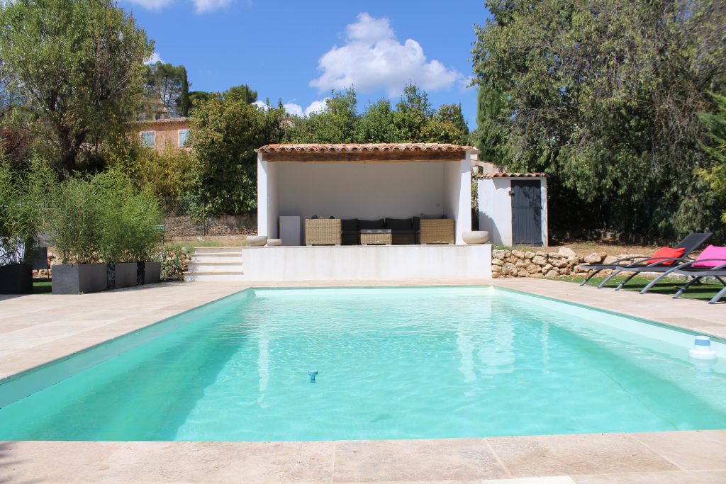 Der Pool kann von den Gästen mitgenutzt werden. Hier befindet sich auch ein Poolhouse mit Gartenliegen und Gasgrill.