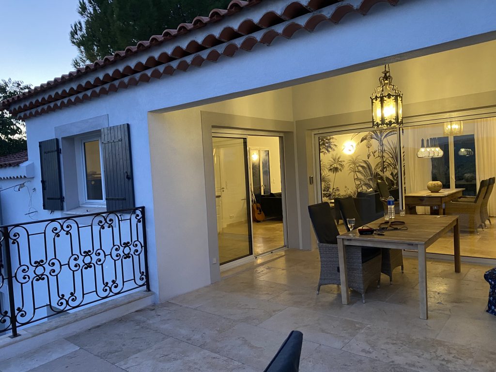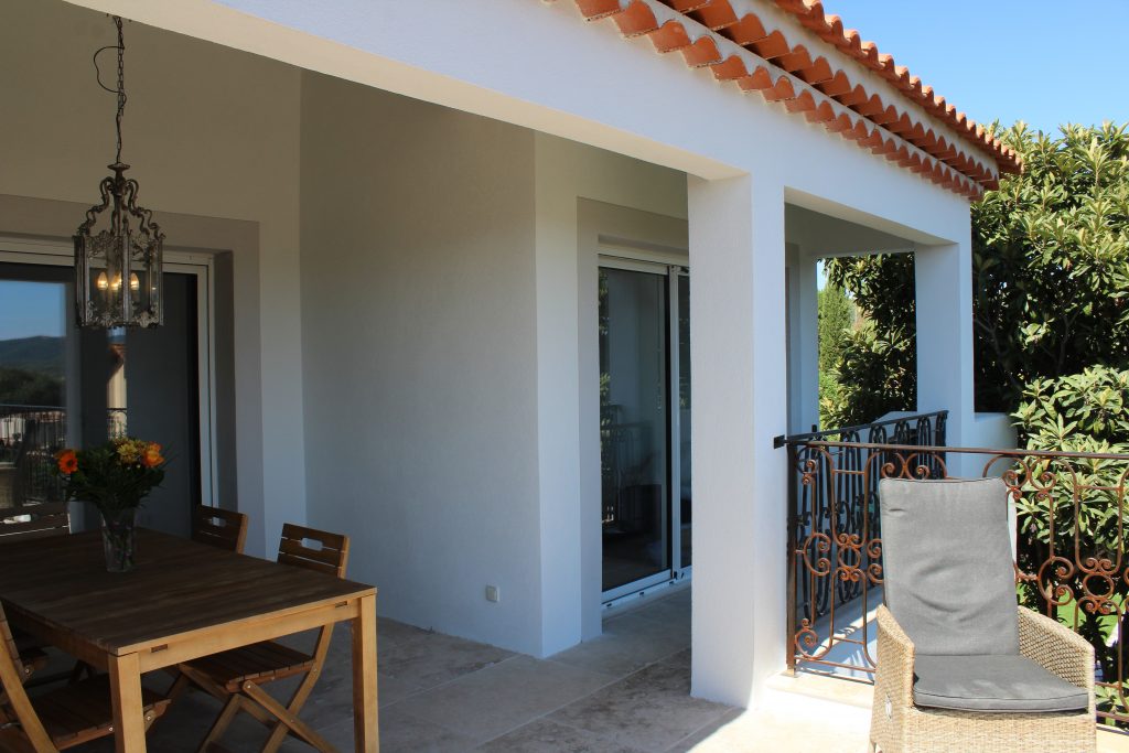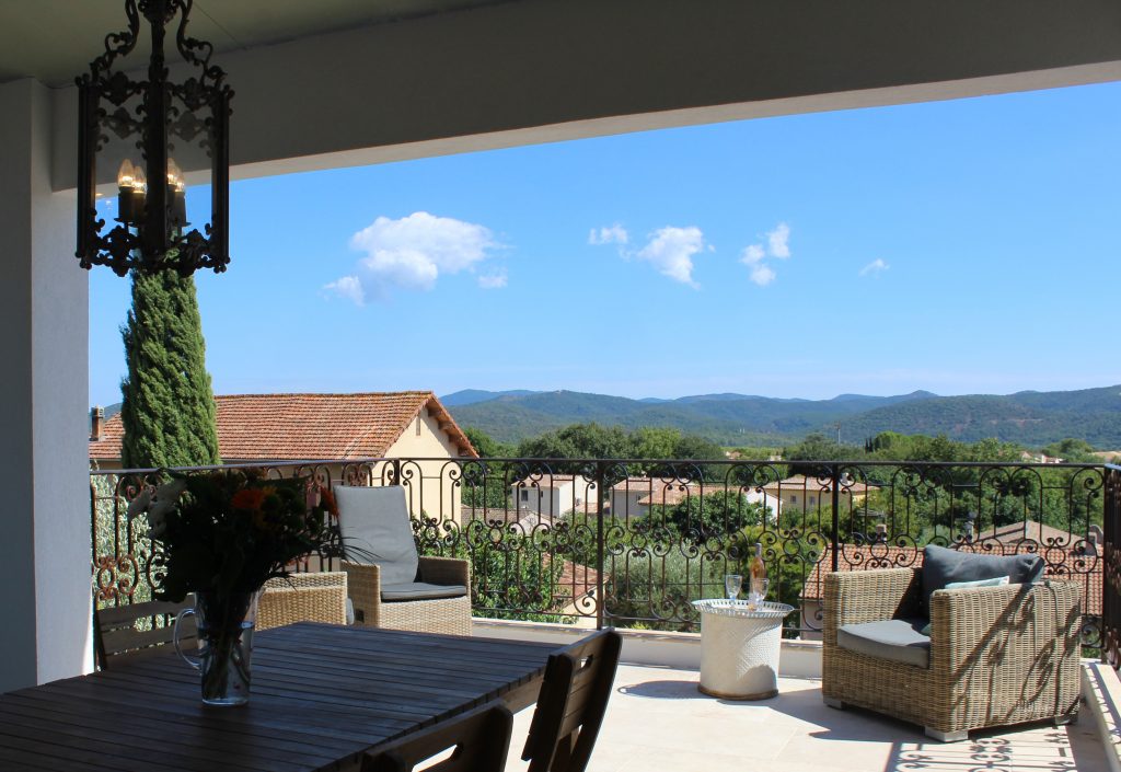Große Glasschiebetüren führen direkt aus dem Salon und dem Schlafzimmer auf den 24qm Balkon mit herrlichem Blick auf das Massiv des Maures. Hier kann man ungestört Sonne und die schöne Aussicht genießen.